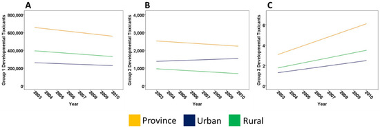 Developmental toxicants in amounts (tonnes). (A) Group 1 DTs demonstrated a decreasing trend in the province, (* p = 0.004); (B) There was no statistically significant decrease in Group 2 emissions in the province and its urban and rural regions; (C) Group 3 DTs showed a statistically significant increase in the province overall, (* p < 0.001). DT = developmental toxicant, * p value ≤ 0.004 = significant post Bonferroni adjustment.