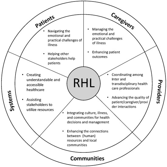 Various types of communities exist among the stakeholders, which both prohibit and facilitate the process of healthcare and management. Local communities, illness communities, and specific cultural groups are a few examples of community in RHL. Fatalistic perspectives shared in a cultural community, for example, would prevent individuals from actively seeking treatment regardless of their health literacy level [57]. On the other hand, belonging to a certain group of people (i.e., illness community) allows individuals with low health literacy to readily access healthy options without understanding the detailed information and/or taking individualized actions [58,59].