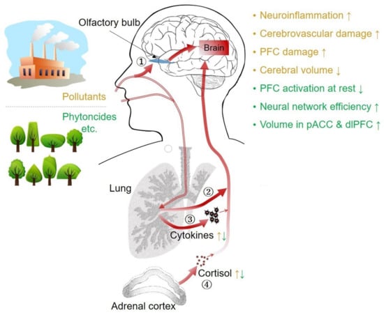 Air pollution and greenspace’s multiple pathways to the brain. Once inhaled, pollutant particles can enter the brain directly via the nasal olfactory pathway ① or indirectly through the circulatory system after they penetrate the lung tissue ②. They cause inflammation in the nose and lungs and release pro-inflammatory cytokines into the circulation ③. In addition, they activate the hypothalamus–pituitary–adrenal (HPA) axis and increase the blood levels of stress hormones, including cortisol ④. Both pro-inflammatory cytokines and cortisol can reach the brain. Greenspace produces phytoncides and other health-promoting chemicals such as negative air ions, which affect the brain through similar pathways but in the opposite direction. For a more comprehensive review of the pathways, see [22,23,25].