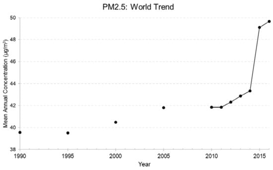 The growing pressure of human activities is associated with the clear deterioration of many planetary systems; in essence we are living on a planet in distress [52] and many aspects of this are getting worse. According to the World Bank [53], the increase of PM2.5 air pollution has accelerated in the past decades (Figure 2). Now 91% of the world’s population lives in places where air quality exceeds WHO guideline limits—mostly in the Eastern Mediterranean and South-East Asia [54].