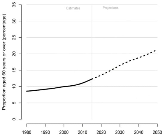Percentage of population aged 60 years or over, from 1980 to 2050. Data source: United Nations [58].