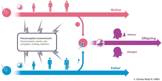 Furthermore, recent studies suggest that not only mothers’ but also fathers’ health behavior and environment may be of importance for the health of future generations [7,8,9]. With regard to the maternal line, there is a growing awareness of the effects of maternal factors in the programming of offspring immunity [10]. Epidemiological and experimental evidence suggests that maternal immune transfer via nursing can provide offspring with long lasting disease-specific protection [11,12]. With regard to the paternal line, it appears that different environmental factors such as smoking and overweight may cause genetic and epigenetic changes in sperm that are transmissible to offspring [7,13,14,15,16,17,18,19,20]. There are several indications that parental exposure before conception might influence disease risk in offspring differentially through the maternal and paternal lines [7].