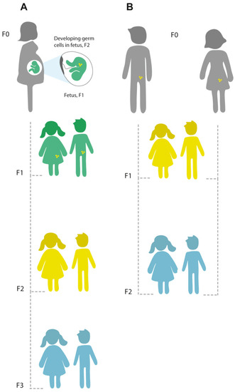Principles of intergenerational and transgenerational epigenetic inheritance. (A) If a pregnant woman (F0) is exposed to an environmental stressor, her son or daughter (F1; green), and his or her germ cells that will form the F2 generation (yellow) are also directly exposed, and this might result in intergenerational effects. The third generation (F3; blue) is the first generation that could represent transgenerational epigenetic inheritance. (B) If a man or a woman (F0) and their germ cells to the F1 generation (yellow) are directly exposed to an environmental stressor, the F2 offspring (blue) is the first generation that could represent transgenerational epigenetic inheritance. (Figure reproduced from [28] under the terms of Creative Commons Attribution License (CC BY) https://creativecommons.org/licenses/by/4.0/).