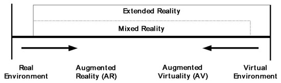Milestones of AR have been presented in several publications [12,13,14,15]. All of them point out reference to diagrams depicting the reality–virtuality continuum by Paul Milgram and Fumio Kishino [16] (Figure 2). There are two types of mixed reality, that is, augmented reality (AR) and virtuality (AV), which are in the scope of interest of geographers and cartographers.