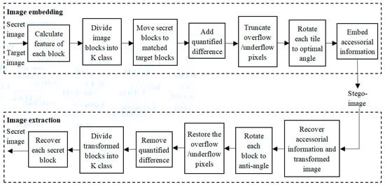 The RIT method may be described with three steps: (1) feature extraction for image blocks matching; (2) reversible shift and rotate transformation; (3) secret image extraction. Details are introduced in Figure 1.