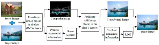 To reduce the AI, we designed an improved RIT method by patching image blocks according to the secret segment. The proposed framework of image embedding is shown in Figure 2. We transformed the image in the last (K-T)-classes using traditional RIT firstly. Secondly, the partial AI from the last (K-T)-classes is represented as the secret segment; it will be hidden in the composite image by patching the blocks in the first-T classes. Then, the pixel values of these image blocks will be shifted to generate the transformed image. Thirdly, the remaining AI is processed and embedded by an RDH method. Finally, the process of image embedding is completed, and the stego-image is generated. Note that the secret image extraction is the symmetrical process of image embedding, which is not described in detail here. Since the proposed method mainly improves image block matching, we will focus on this step.