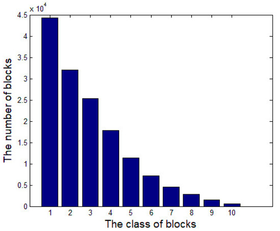 The total number of image blocks in the first T-classes is , where is the number of each classes’ blocks, respectively. Thus, the length of is , and should be divided into secret segments and each segment contains l bits. We calculate the decimal values () for all segments, and count the frequency of each . Then, we divide the secret blocks in the first T-classes into new categories by the frequency , and the secret blocks in each class have the same volume as the corresponding frequency.