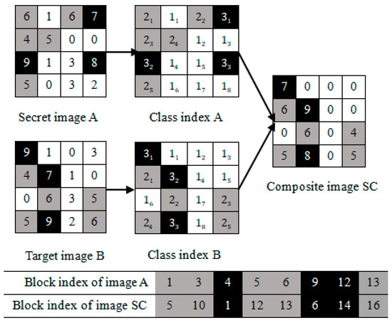 Suppose the image class contains blocks, where . The first secret blocks with the smallest , the second secret blocks with second-smallest , and so on, until the unmatched secret blocks are divided. Next, distribute a compound index to each secret block, where is the block of the class and . Then, the blank blocks of composite image can be divided into new categories by the scanning order of , in which the blocks will be distributed a class index accordding to the decimal values of each secret segment. Finally, the unmatched secret blocks can be patched into composite image, in which the secret block should be replaced to the blank block, and the final transformed image is generated.