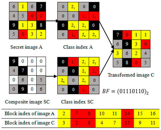 Next, the blank blocks in the composite image can be divided by the scanning order of . For example, the first bit in the is 0. Thus, the first position of unmatched blocks in the composite image belongs to class 1; they are labeled as “red”. The second bit is 1. Thus the second position of unmatched blocks belongs to class 2; they are labeled as “yellow”. Then, the new class index for the unmatched block can be defined. Finally, the secret blocks should be replaced to the blank block, and the final transformed image is generated.