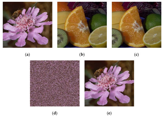 An example that reflects security (a) Secret image. (b) Target image. (c) Stego-image. (d) Recovered image (wrong key). (e) Recovered image (correct key).