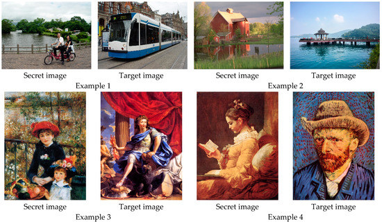 We used MATLAB-R2014a to perform the experiments; our test machine was an Asus PC with 4200 CPU @2.80 GHz and 8.00 GB RAM. The test images shown in our experiments are listed in Figure 7, which are adopted by much computer or camera equipment in the PNG format. In this subsection, four typical combinations of secret and target images in Figure 7 are applied to discuss how to correctly set the parameters of the proposed method. Moreover, we can obtain different AI and transformed image qualities by setting different parameters for these test images. However, the ultimate stego-image quality can be improved when we have higher stego-image quality and lower AI. Therefore, the optimal parameters of the proposed method can be found by the relationship of AI and transformed image quality.