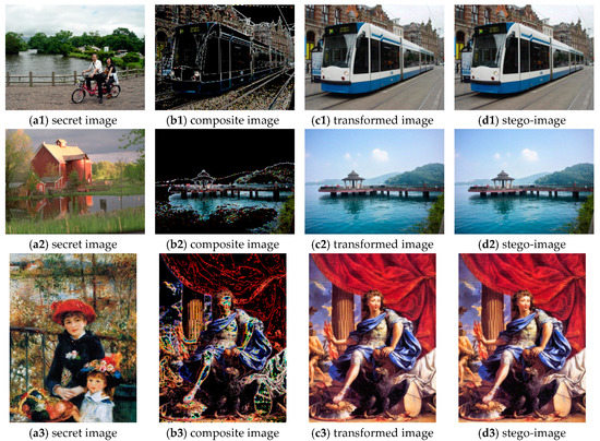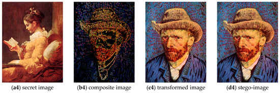 In order to represent the results of each transformed phase and prove the algorithm’s feasibility, the transformed results of secret image are shown in Figure 8. There is the secret image, composite image, transformed image and stego-image of four example. Take Figure 8(a1–d1) as an example, we firstly transform the secret image (a1) blocks in the last (K-T)-classes to generate the composite image (b1). Note that the pixel values of unmatched blocks in the first T-classes is set to 0. By the composite image, we only obtain the texture details of target image because these matched blocks have slightly big SDs. Then, we patch the secret blocks according to the AI from the last (K-T)-classes transformation to obtain the transformed image (c1). Finally, we embed the AI by the RDH method to achieve the stego-image (d1).