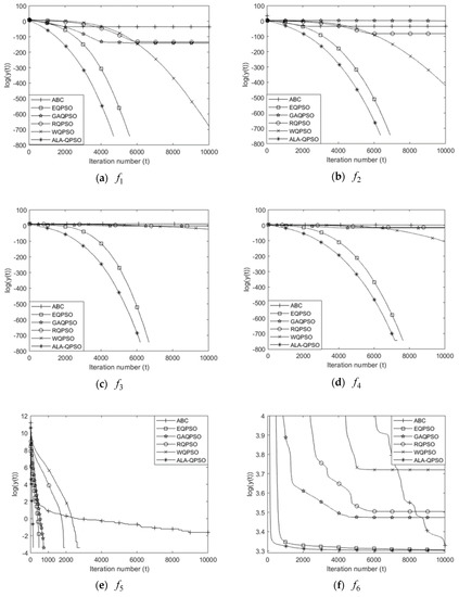 For all compared algorithms, the population size is set to 20 [22,24]. For ABC, the limit number of iterations which a food source cannot be improved (Trial limit) is set to 100 [25]. For all kinds of QPSO, the contraction–expansion coefficient () decreases linearly from 1.0 to 0.5 during the search process, the local attractors are calculated by Equation (4) except for ALA-QPSO.