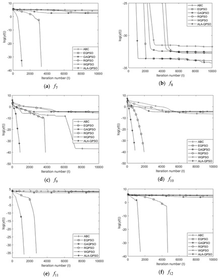 Moreover, Figure 1 and Figure 2 present the converging curves for the twelve selected functions. Note that the logarithmic of the mean of the best object value according to the iteration, which is denoted , is as -coordinate and the iteration number is as -coordinate. Since the logarithmic function is a negative infinity (not shown in the figures) when the obtained best object value is zero, some curves stop after a certain number of function evaluations. From Figure 1 and Figure 2, it can be obtained that both ALA-QPSO and EQPSO can find the global optimum of ~, and ~ for 30 dimension problems, also, ALA-QPSO requires fewer iterations than EQPSO; ALA-QPSO can find smaller average objective function values than those of other algorithms on and for 30 dimension problems. The convergence curves of ALA-QPSO for all the functions sharply dropped off at a certain point during the early stage of optimization.