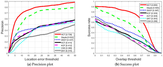 Figure 6b shows the success rate plots containing the overlap precision. The mean precision scores for each tracker are presented in the legends. Again, our proposed HCT outperforms Staple by 30% and the baseline KCF tracker by 90% in mean success rate.