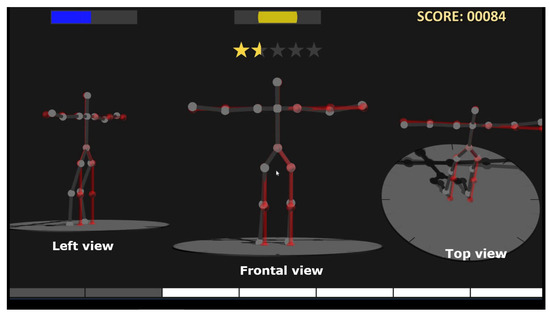 Implemented in the RG module, the protocol is based on exergames that engage people in an entertaining way while offering motivation for physical exercising [25]. An exergame is split into a set of static postures to be performed. The senior has to reach the desired posture in a given time defined according to the difficulty level of the exergame. The quality of the performance between the desired postures and the ones realized by the senior is scored (RG_SCORE) and ranked in stars. Stars are a graphical evaluation of the matching quality of the postures. The exergames are conceived, by the physiotherapist, to improve balance/coordination, gait, muscle strength and joint flexibility of the senior. The exergames are inspired by published literature regarding the physical activity and exercise for older adults [28,29,30] (http://www.nhs.uk/exercises-for-older-people).