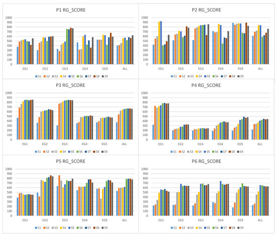 The graphs show the RG_SCORE obtained by each participant (P1, P2, P3, P4, P5, P6) during 5 exergames (EG1, EG2, EG3, EG4, EG5, ALL) and 9 sessions (S1, S2, S3, S4, S5, S6, S7, S8, S9) with the RG module.