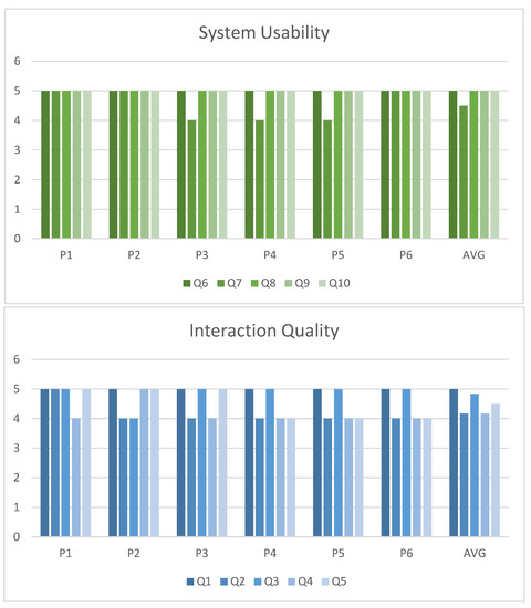 Means and standard deviations have been used to describe the data. All the participants involved in the experiment assigned a high score to the usability items and to the interaction quality items. Therefore, the overall average and standard deviation scores for the usability (M = 4.6, SD = 0.10) and for the interaction quality (M = 4.9, SD = 0.11) have been calculated and can be considered as very satisfactory for the system evaluation. The answers to the questionnaire have been depicted in Figure 5.