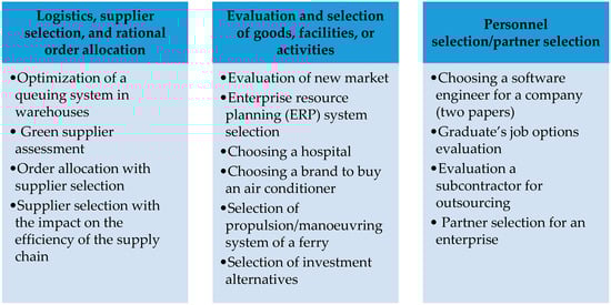 The case studies and application examples of the proposed approaches presented in the papers are mainly concentrated in three areas (Figure 3). One group of papers suggests different approaches for supplier assessment and selection, including the topical question of green supplier selection, as well as order allocation and the optimization of queuing systems in warehouses. The next group of applications is related to the evaluation of facilities or goods from the viewpoint of consumers such as brand selection, airline evaluation, or choosing a hospital, and from the view point of enterprise managers such as enterprise resource planning (ERP) system selection, technology selection, or the evaluation of investment alternatives. The last group of papers suggests multiple-criteria approaches for personnel or partner selection optimization as well as job options evaluation.