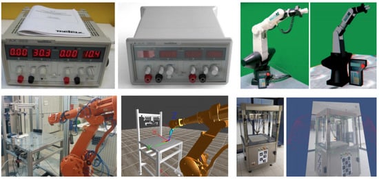 Real engineering labs and its representation in VR. From left: power block [78], CRS robotic arm [79], robotic cell for shoe-sole gluing [80] and industrial picking robot [81].