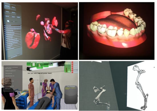Medical VR is an area with great opportunities, which is confirmed by many clinical researchers and real medical practitioners [87,88]. It helps physicians, nurses and students to improve the quality of medical skills through real-life scenarios, which provide an opportunity to learn-by-doing. Although the field is brand new, there are already great examples of VR applications having a positive effect on medical education. In this section, the most interesting VR medical educational applications are briefly described. Figure 4 presents screenshots of selected VR environments.