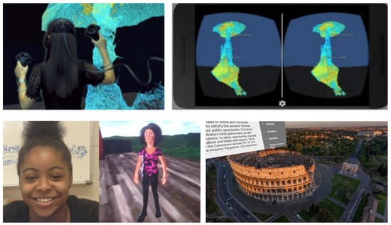 VR may serve as a low-cost, easy-to-use user-friendly tool and resource [104,105,106,107]. There are a number of engaging projects that can be used in the classroom [108]. A great example is Google Expeditions, which allows the teacher to take an entire class on virtual trip. The application recreates an immersive experience of a real-world with 360-degree videos shot of different locations such as an underwater exploration of a coral reef in the South Pacific or the Louvre museum in Paris using Google Street View technology [109]. VEnvI (Virtual Environment Interactions) [110] is a visual programming tool that combines dance, computational thinking and embodied interaction. The system was created for high school girls to increase the appliance of STEM fields. The application of VEnvI and the immersive, first-person interaction were carried out as an activity of a summer camp for middle school girls. The participants of the program (54 girls between the ages of 11 through 14) had to use computer science and programming concepts to program dance moves for avatars. With the help of Oculus Rift HMD, the participants had the opportunity to be present with the virtual character they are programming, have a first-person perspective of the choreographed performance, make changes and correct mistakes. Some of such use cases are shown in Figure 5.