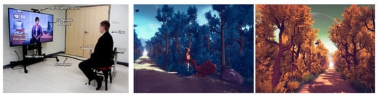 Screenshots of VR applications for special needs education: Left: User interacting with components of VR system [122]. Middle and Right: VR environment that participants moved through while walking on the treadmill [123].