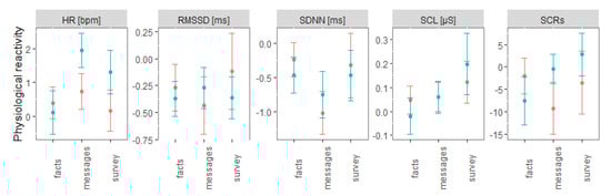 The results of multiple linear mixed models with experiment segment and manipulation condition as fixed effects and subject as random effect showed physiological reactivity differed significantly between experimental segments for HR, SDNN, and RMSSD (Table 4). On average, SDNN and RMSSD were 89 and 36 ms lower, and HR 1.30 bpm higher during the persuasive messages compared to the short baseline. During the factual video, HR reactivity was 1.03 bpm lower than during the persuasive messages, whereas SDNN reactivity was 54 ms higher (see also Figure 2). With the exception of number of skin conductance peaks, the difference in experiment segments explains between 32.7% and 44.9% of the variance in physiological reactivity based on the conditional R2, i.e., based on both fixed and random effects [34]. There was no significant effect of manipulation on physiological reactivity.