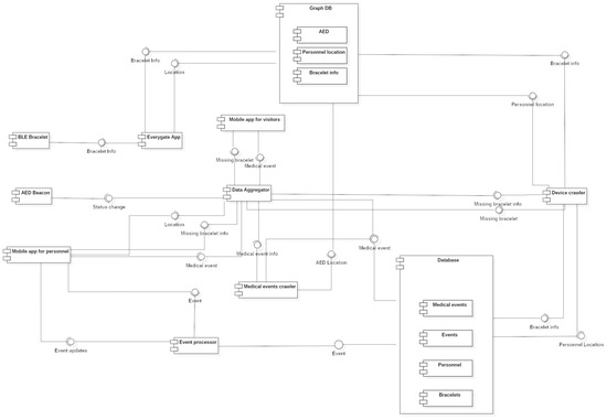 In more detail, the modules that will be part of the Hardware layer include, mainly, mobile devices (e.g., smartphones and wearables) which will incorporate embedded sensors to generate data and “fuse” the system with them. Actuators will also be used (e.g., light beacons, AED (Automated External Defibrillators)) as part of the system’s smart infrastructure, to increase the performance of the system responding to certain, critical events (e.g., health cardiac issues of visitors). In DESMOS, two applications for the mobile devices will be developed. The first one would be used by the visitors before entering certain areas of the city of Trikala, to enable them to enter, register, and use the smart capabilities provided by DESMOS system, when those are needed according to the three use case scenarios. The second mobile application will be used by the responsible personnel to gain access to detailed information regarding on-going events that might need their action. Wearables and button-like sensors will also serve this layer mainly through the collection of data (e.g., user’s location) that will provide to the system. The personnel will use one more application in the mobile devices called Everygate, which is used in telematics solutions [24]. In the DESMOS project, this application will scan the area through mobile anchors equipped with BLE and WiFi technology for specific BLE bracelets that will be used by the children and send this information to the platform. Additionally, it will send the location of each member of the personnel to the platform, which is known as they have GPS or WiFi availability. This allows the modules in the platform to find the exact location of a child wearing such a bracelet in case it is needed. Finally, a number of stationary devices will be deployed which will run the Everygate software. The reason for these devices is to cover inside spaces and key points of the area, such as the entrance.