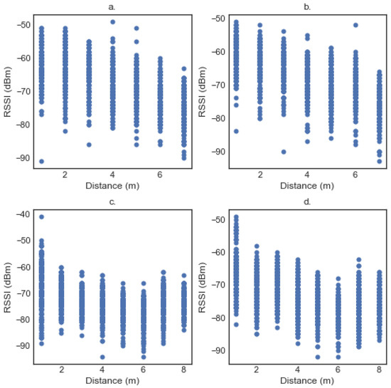 The scatter plots for Band 2 and Band 3 in the outdoor environments are in Figure 3c,d, respectively. The distance range is varied from one meter to eight meters. In each position, we took over 150 measurements. From these figures, we can notice that there is an almost identical behaviour between the two smart bracelets. In addition, we can see that there is an increase after some meters in the RSSI that is due to the outdoor environment with some trees and walls influencing the wireless signal. From the data above, we can conclude that the raw RSSI values are not reliable enough for the localization as it is observed in most of the bibliography [30,31]. We suggest some statistical filters in the next paragraphs, in order to improve the stability of the RSSI values and some machine learning techniques to find the distance from the RSSI values.