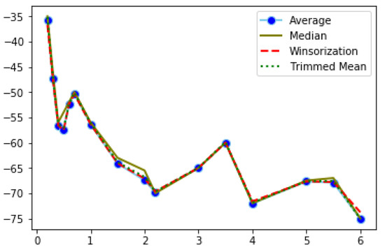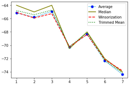 Average and median are well known descriptive measures; however, the average is more sensitive to outlier values. Trimmed mean calculates the average of observations after excluding values outside a specific proportion of data. Winsorization replaces the values exceeding a given lower and upper bound, with the values of the respective bounds [32]. Kernel density was also tested, though it did not perform as well as the other methods, thus the results are not presented here. For the trimmed mean, the observations exceeding 90% of the data were excluded. The Winsorization technique used 5% as lower and upper bounds. Figure 4, Figure 5 and Figure 6 show the results of the filtered RSSI recordings for the calibration set, obtained from band 2. The calibration set consists of 100 recordings of each distance point. The signal is supposed to weaken as the distance increases; however, this is not always the case, as it can be seen from the above-mentioned figures. After applying the Winsorization technique, the average values of the filtered dataset were taken and presented in the aforementioned figures.