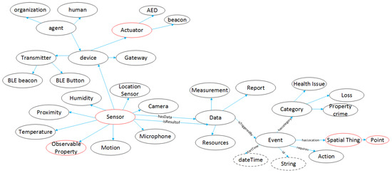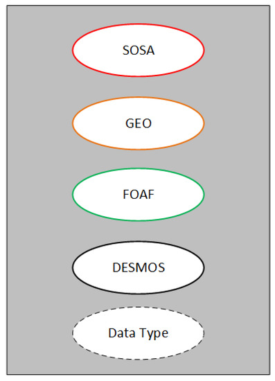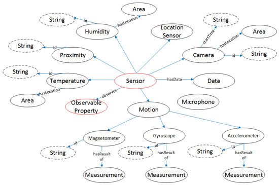 Ontologies and technologies of Semantic Web are being widely used for the representation of the data and the ontologies of the IoT. Ontologies provide the means for a structured description of an object or concept. They are used to semantically enhance resources, through facilitating the understanding of the meaning of the metadata that are associated with sensor objects [10]. The addition of semantics to sensor networks leads to the so-called Semantic Sensor Web (SSW). In 2012, W3C (World Wide Web Consortium) suggested an innovative ontology, the Semantic Sensor Network (SSN), as a human and machine-readable specification that covers networks of sensors and their deployment on top of sensors and observations [11]. The target of this project was to face the problems that arose from the heterogeneous data from different devices. However, there are limited ontologies that annotate the time–space correlation between the sensor data and the resources. In addition, SSN has only one class for all the sensors, and it is difficult to annotate the different parameters of each sensor. In order to overcome that, the authors in [12] deployed the Sensor, Observation, Sample, and Actuator (SOSA) ontology providing a formal but lightweight general-purpose specification for modelling the interaction between the entities involved in the acts of observation, actuation, and sampling.
