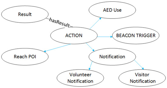 An entity Action is a process that aims to change a state of a process and produce a result. As we can see from Figure 9, an Action might be an AED use, a beacon trigger, a visitor, or volunteer notification and reach of a point of interest. All the previous lead to a Result through hasresult property.