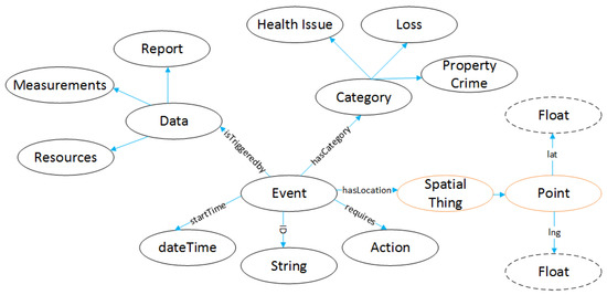 An event entity is an event derived from the data of the different sensors in the field of the use cases in Desmos. In Figure 10, it is shown how an Event is triggered (isTriggedBy) from Data class, which consists of Measurements, Reports, and Resources. Each Event belongs to a specific category (hasCategory) depending on the use case scenarios covered by Desmos. Those are Health Issue, Property Crime, and Loss for the missing people or missing a thing. Each Event has a location (hasLocation) though the Spatial Thing class that targets to a Geo point. In order to identify each event, we add an ID of String class, while also adding a dateTime linked through startTime property. Finally, all Events have an Action entity, in order to face the critical situation.