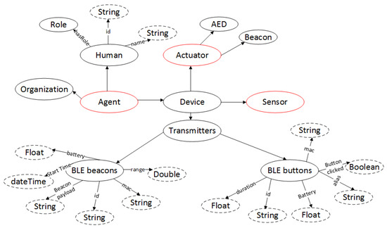 Agent ontology (Figure 13) refers to different people, groups of people, a software or a device. It consists of Organization, Human or Device class. Device can be an Actuator device (AED, LED light, a siren) or a Beacon. In addition, a Device can be a gateway or other transmitting device that transfers data from the devices to the Desmos platform.