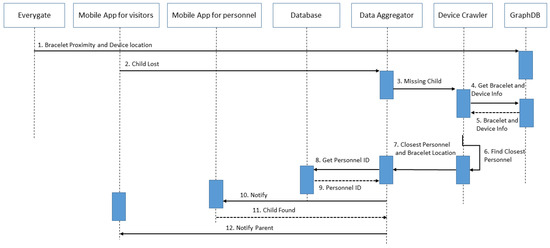 Figure 14. The Unified Modeling Language (UML) diagram of the MylosKidFinder use case. - MylosSense and CitySense: “Record and Real-time reporting of natural disasters or vandalism of buildings—monuments—points of interest.” The third use case scenario is about real-time reporting of criminal acts, incidents of violence, theft, etc. for the timely handling of dangerous incidents and the recording of frequency as a preventive criterion in the future in both the theme park and the city center. Both visitors and personnel members will be able to report events that happen through the mobile applications. The report will include a description, the event location, and a media file. Depending on the severity of the event, personnel members will go to the location to check and proceed accordingly.
