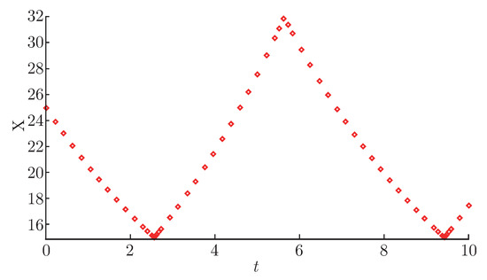 The ILAHS’ behaviors are expressed as trajectories. For instance, we assume that , , , , , , and . If the initial temperature of the room is C, then one possible trajectory is as follows (Figure 3):