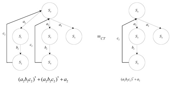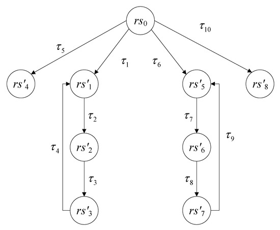 Given an error derivation , is -approximate completed trace equivalent to (Figure 9), i.e., in the semantics of completed trace equivalence, is identical to , which involves fewer states. Therefore, the original hybrid automaton (Figure 7) can be reduced to an equivalent but simpler hybrid automaton (Figure 10), and the design of the hybrid system is optimized with the theory of approximate completed trace equivalence.
