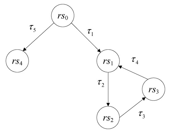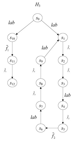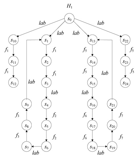 However, consists of abstract actions, which are unable to express the exchange details of the data stream. In 2008, Sankaranarayanan et al. [30] defined a hybrid system program model with polynomial equations that took the place of abstract actions and opened up a new method of hybrid system design and verification based on polynomial algebra. For example, the transition with indicates the relation , the variable x refers to the current state, and to the next state of a transition.