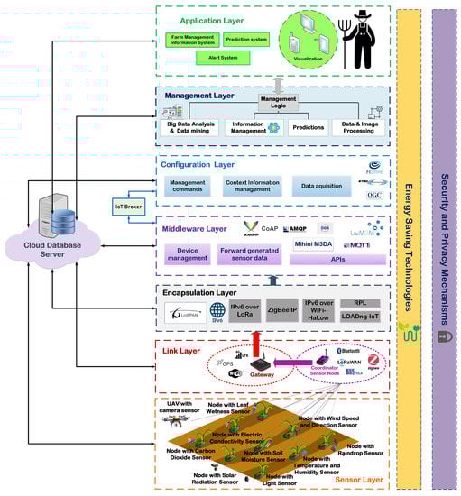 - The Encapsulation Layer, referring to the Network Layer of the OSI Model, focuses on the establishment of smart sensor connection to the IPv6-based internet. This layer consists of IoT networking encapsulation techniques and routing protocols to transform the regular WSN network traffic into smart information. In other words, the technologies of this layer enable the cultivated field sensory data to be encapsulated in IPv6 routing packets and be forwarded to the according network server.