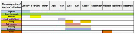 The cultivation process includes harvesting the flowers, as presented in Figure 2, splitting the stigmas and stamens from the petals, drying and sorting of saffron. The picking of 1000 flowers is process of a duration around 45–55 min, while additional 100 to 130 min are required for removing the stigmas for drying. In total, 370 to 470 h are required to produce 1 kg of dried saffron [52]. The flowers are picked exactly when they are fully bloomed, and the saffron strand or stigma is at its reddest. The harvesting process begins shortly after dawn to minimize the further sunlight exposure to the crops, since they may lose their color and even flavor. Saffron cultivation requires dry soil with specific levels of moisture, controlled irrigation and right amounts of nitrogen, phosphorus and potassium. Cultivation is commonly disturbed by mice, moles and rats wrecking the stems. Furthermore, fungi may cause specific diseases at the early stages of saffron growth.