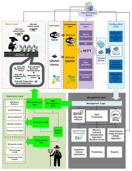 - The Management Layer involves the processing and analysis of the collected data. In this layer the most efficient data management and data mining techniques are adopted to obtain accurate predictions and support regarding field operations such as optimized pesticide application, disease detection, efficient irrigation management. Data processing is supported by Decision Support Systems (DSS) that take care of the overall management of available collected information from the fields towards increasing productivity, optimizing crop yield, maintaining quality and saving resources. It is well known that farmers suffer great economic losses due to incorrect weather forecasting or incorrect irrigation methods. Data analysis is the most important component of IoT agricultural systems resulting in efficient pesticide use and protection against diseases. This layer can be considered to be an additional layer regarding the OSI Model enabling artificial intelligence advancements to the overall system.