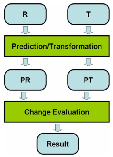 - Prediction/Transformation. The original reference image (R) and test image (T) are transformed to new spaces as PR and PT. In change detection, the reference image normally refers to an image at an earlier date, and the test image is the image at a later date.
