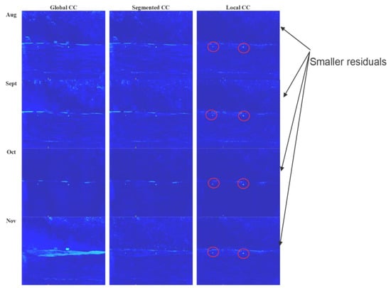 Residuals of global CC, segmented CC, and local CC. First row: Aug. and Oct. image pair; Second row: Sept. and Oct. image pair; Third row: Oct. and Oct. image pair; Fourth row: Nov. and Oct. image pair. Blue pixels mean small errors.
