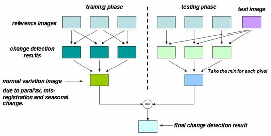 In addition to illumination changes, seasonal changes, and atmospheric effect, it is well known that image registration may not be perfect. In addition, parallax is an important practical issue during data collection. Here, we describe a change detection approach using multiple reference images, if they are available, to alleviate these problems. The Multiple References Change Detection (MRCD) algorithm proposed in [] is modular, flexible, and nonlinear, as nonlinear operations are involved. Figure 4 [] shows the signal flow in MRCD. Details of the MRCD are shown below (Algorithm 1).