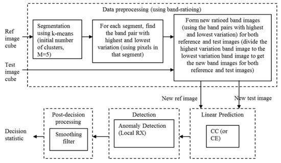 The definition of band-ratioing is simply the ratio of the pixels from two images [,]; many variants that are well-known. For example, the normalized difference of vegetation index (NDVI) has been widely used for vegetation detection. A new change detection framework that utilizes new, band-ratioed images was proposed []. According to this idea, the reference image cube is first segmented, and for each segment, two bands are determined according to lowest and highest variation in the pixels belonging to the same segment. The new band image is then obtained for both the reference and test image cubes using the same band pair. This has been repeated for all other segments. That is, if there are M segments, there will be at most M new image bands at the end of band-ratioing (for both reference and test image cubes) to be used for change detection. The change detection framework with the band-ratioing idea is introduced in Figure 5 []. It can be seen that the architecture is modular and flexible, as we can apply different algorithms in each individual block.