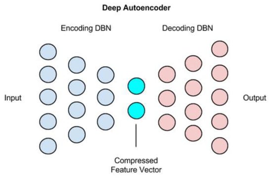 An unsupervised change detection algorithm based on a deep autoencoder was proposed by Xu et al. []. The architecture of the auto-encoder is shown in Figure 6 []. The idea is to train the autoencoder with patches from image 1 as inputs and patches from image 2 as outputs. The validation data are two sets of the same patches from image 1. Then, to compute the changes, one needs to evaluate all the patches of image 1 in the autoencoder and then subtract each of the decoded patches by their corresponding patch from image 2. Motivated by the work in [], the following algorithm summarizes the change detection algorithm using an auto-encoder for MS images (Algorithm 2). More details can be found in [].