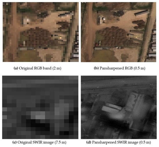 Multispectral (MS) and hyperspectral (HS) images have more bands than the RGB images. Well-known examples of MS images include Landsat and Worldview images. Landsat has 11 bands [], and Worldview-3 images have one panchromatic, eight visible and near infrared (VNIR), and eight short-wave infrared (SWIR) bands []. The spatial resolution can differ a lot. Landsat has 30 m resolution in most bands, and Worldview-3 has 1.2 m resolution in VNIR bands and 7.5 m in SWIR bands. Examples of HS images include Airborne Visible/Infrared Imaging Spectrometer (AVIRIS) [] and Adaptive Infrared Imaging Spectroradiometer (AIRIS) []. AVIRIS images have 224 bands in the range of 0.4 to 2.5 microns. AIRIS is a longwave infrared (LWIR) sensor with 20 bands for the remote detection of chemical agents such as nerve gas.