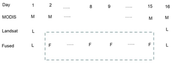 - Gao, F.; Masek, J.; Schwaller, M.; Hall, F. On the blending of the Landsat and MODIS surface reflectance: Predicting daily Landsat surface reflectance. IEEE Trans. Geosci. Remote Sens. 2006, 44, 2207–2218. [Google Scholar]