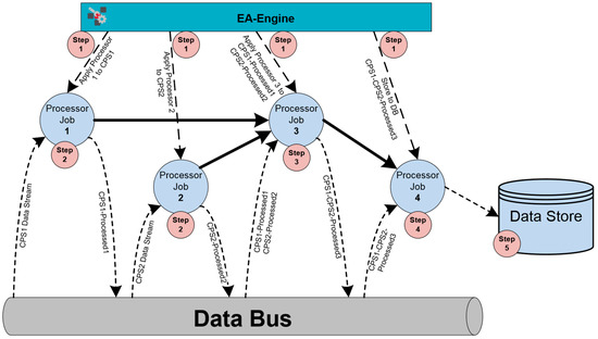 In addition to interacting with the Device Registry, the DR&P component provides a Data Bus, which is used to route streams from the various devices to appropriate consumers, i.e., processors of the EA-Engine. The Data Bus is not restricted to routing data streams stemming directly from the industrial devices and other shopfloor data sources. Rather it can also support the routing of any data streams and events that are produced by the EA-Engine. Overall, the EA-Engine is a configurable runtime environment hosted in an edge gateway, which executes data analytics close to the field in order to meet stringent latency requirements.